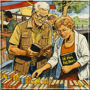 De oude vrouw draagt opvallend kleurrijke kleding met bloemmotiefjes, een bril met felrood montuur en haar grijze haar is gevlochten in een lange staart. Ze staat naast me, bij een van de boekenkramen in de Museumstraat waar ze wacht tot ze de aandacht heeft van de handelaar. Als hij haar aankijkt, steekt ze van wal: ,,Ik zoek een boek”, zegt ze. Dat maakt weinig indruk op de kraamhouder, die zich zienderogen inhoudt door deze kans voor open doel niet in te schieten. Zuchtend repliceert hij iets meer informatie nodig te hebben. Die krijgt hij ook. ,,Het is een boek met daarop een tekening van twee mensen in een koetsje. Zij draagt een witte bloes en hij een blauw pak met rode stropdas. Het gaat over twee meisjes die op het platteland een kasteeltje erven. Ze zeggen hun baan op en maken er een hotelletje van. Dat gaat een tijdje goed, totdat één van hen verliefd wordt op de dorpsdokter. Maar die ene zus is stikjaloers en dan krijgen ze ruzie. Nou ja, veel gedoe en op een gegeven moment praten ze niet meer met elkaar. Dat ene meisje, die verliefde dus, maakt het uit met die dokter en gaat terug naar de stad. Uiteindelijk komt het allemaal weer goed omdat er er op dat landgoed een kind vermist is en iedereen gaat helpen zoeken. Afijn, dat kind wordt gevonden, iedereen blij, zusjes leggen het bij en het eindigt met een huwelijk in dat kasteeltje. Hebt u dat boek?” De handelaar denkt nog geen seconde na en zegt kurkdroog: ,,Nee, dat heb ik niet.” De oude vrouw bedankt en loopt door naar de volgende kraam. Ik schiet in de lach en vraag de handelaar of hij zoiets wel vaker meemaakt. ,,Wel tien keer op een dag”, antwoordt hij. ,,Maar weet je dan ook écht over welk boek het gaat?”, vraag ik. ,,Ja hoor. Het heet Eendagsbloemen, is geschreven door Leni Saris en verschenen in 1957. Is veel vraag naar. Ik wou dat ik het had.”
