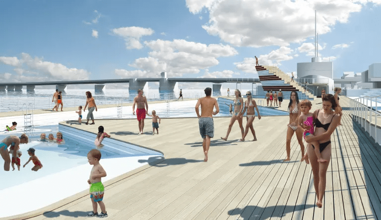 Er zit vast asfalt in mijn bloed, want tijdens vakanties heb ik meestal snel genoeg van stilte en natuurschoon en verlang ik na enkele dagen alweer ernstig naar winkels, terrasjes en straatgeroezemoes. Aangezien mijn dochter aan datzelfde euvel lijdt, valt vaak al gauw de beslissing om een stadje te bezoeken. Het leukst vind ik plaatsjes die qua ligging en inwonertal enigszins vergelijkbaar zijn met Dordrecht. Noem het vakverdwazing, maar ik vind het nu eenmaal interessant om te kijken hoe men, juist in vergelijkbare steden, omgaat met de problemen die wij ook kennen en hoe men de eigen specifieke charmes aldaar weet te etaleren. En zo liep ik ineens in het Deense Aalborg, een stad aan het water in het noordelijke gedeelte van Denemarken. Goed, Aalborg ligt niet echt aan een rivier, maar wel aan een zeearm die qua breedte met onze Merwede te vergelijken is. Net als Dordrecht is ook Aalborg ‘opgebouwd’ in een halvemaanvorm vanaf het water en kun je er, net als bij ons, langs de rivier (in dit geval dus die smalle zee-inham) wandelen. Het meest duidelijke verschil met Dordt is dat het winkelgebied naadloos overloopt in een terrasrijke wandelboulevard aan het water, plus het feit dat er aan die waterkant veel meer leven is. Zo ontwaarde ik, gelegen tussen twee aangemeerde historische schepen, iets heel bijzonders, namelijk een stadsstrand of beter gezegd een soort zwembad. Eigenlijk was het een soort ponton in het water, waarvan de zijkanten als filters dienden om het zwemwater (dat dus van buiten uit door die wanden naar binnen sijpelt) schoon te houden. Alles, zo legde iemand mij uit, duurzaam gebouwd met materialen die mij erg deden denken aan het natuur- en milieucentrum Weizigt. Er waren ook een terrasje, een sauna, kleedkamers, toiletten en een soort platformpje met strandstoelen. De Aalborgse jeugd zwom en ‘flaneerde’ er op deze zonnige dag naar hartenlust. Op een groot bord werd uitgelegd dat het ‘Havnebadet Aalborg’ op zonne-energie werkt en dat het bad bekostigd is door de gemeente in samenwerking met alle grote bedrijven uit de stad.