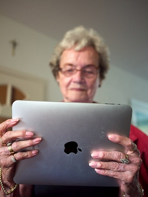 ‘Hallo Bandoeng! Ja moeder, hier ben ik. Dag lieve jongen zegt ze met een snik.’ Ik kan er niets aan doen, maar deze smartlap van Willy Derby schiet door mijn hoofd als ik het tafereeltje in die kleine huiskamer van de Dubbeldamse seniorenwoning gade sla. In een comfortabele leunstoel zit een oude vrouw wat onwennig met een iPad in haar handen naar het beeldschermpje te kijken. ,,We maken nu verbinding,’’ zegt haar kleindochter Maaike. ,,Als het goed is krijgen we straks oom Bob in beeld.’’ En dan geschiedt het wonder: ,,Dag man, kun je mij horen? Kun je mij zien? Ik zie jou wél hoor. Ben je naar de kapper geweest?’’ Oma staart met grote ogen naar het schermpje in haar handen, maar kan even geen woord uitbrengen. Haar stem stokt als ze haar zoon, die twee jaar geleden naar New York verhuisde, voor het eerst terugziet. Bob, als internationaal jurist werkzaam bij een afdeling van de UN, zit achter zijn bureau en op de achtergrond, zij het ietwat onscherp, zijn de contouren te zien van de stad die nooit slaapt. ,,Je kunt gewoon terugpraten hoor,’’ zegt Maaike. Oma kijkt haar kleindochter aan en zegt: ,,Kan hij ons nu horen?’’ Maaike lacht. ,,Hij kan je zelfs zien… en mij ook. ,,Hoi oompje, hoe is het daar aan de overkant?’’ Nu schiet ook Bob in de lach: ,,Hard voor weinig,’’ roept hij in plat Dordts. En dan, als ze haar stem weer heeft teruggevonden, begint ook oma te praten. ,,Hallo jongen. Hoe is het met je? Wanneer komen jullie weer terug? In juli hebben we vakantie en die brengen we in Dordt door,’’ belooft hij. Het gesprek duurt voort, maar ik heb genoeg gezien en loop naar het balkon. Daar feliciteer ik kleindochter Maaike met haar afstudeerproject ‘De iPad voor ouderen’, die ze na haar studie verder gaat ontwikkelen voor een bekend cursusinstituut. Haar eigen grootmoeder was haar eerste ‘testcase’ en ik mocht daarbij getuige zijn. ,,Vond je het ontroerend?’’ lacht Maaike, als ze ziet dat ik achter mijn bril wrijf. ,,Nee joh, vliegje in mijn oog,’’ antwoord ik stoer.