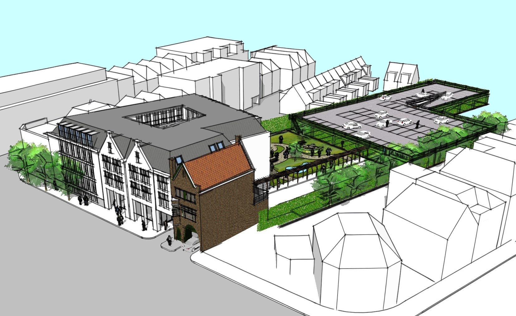 Een parkeergarage verderop op het binnenterrein meteen tegen de achtertuinen van de hofwoningen zal de bewoners daar van alle privacy beroven.