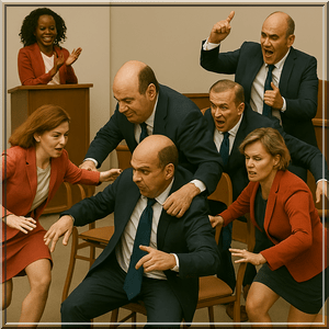 In sommige parlementen (ik herinner me journaalbeelden uit Turkije, Rusland en Jordanië) willen parlementariërs nog wel eens ouderwets met elkaar op de vuist gaan. Dat levert soms grappige, Asterix-achtige tafereeltjes op, waar ik erg om moet lachen, terwijl het eigenlijk helemaal niet grappig is. Een vergaderzaal hoort namelijk een veilige plek te zijn waar je, zonder angst voor een optater, voor je mening moet kunnen uitkomen en dus dient men zich daar te beheersen. Oké, een beetje joelen mag best, zoals in het Engelse parlement bijvoorbeeld waar je nog weleens ‘hear, hear’ hoort als men het ergens hartgrondig mee eens is, totdat de voorzitter er (‘order in the house’) weer een eind aan maakt.