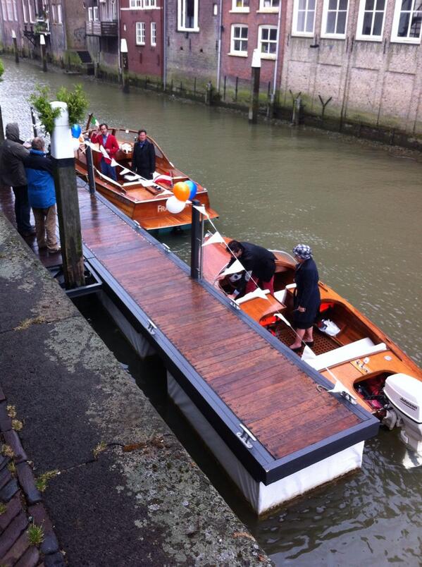 Afbeelding: de steiger in de Voorstraatshaven is een doorn in het oog van de Vereniging Oud Dordrecht (Twitterfoto @irene_koene).