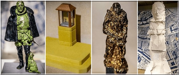 De ontwerpen (van links naar rechts): een traditionele ‘Willem op een sokkel met hondje’ van Arie Schippers; een ‘vitrinekast’ van Pieter Laurens Mol; de ‘smeltkaars’ van Anne Wenzel en ‘het angstige spook’ van Johan Tahon.