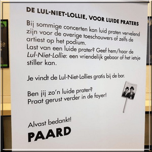 Leuk hoor, zo’n lul-niet-lolly. Wat dat is? Nou simpel, da’s een lolly waar ‘lul niet’ of ‘Sssst!’op staat en die kun je demonstratief overhandigen aan notoire kletskousen die zichzelf kennelijk belangrijker vinden dan de act op het podium. Bibelot, dat de laatste jaren steeds vaker met dit probleem geconfronteerd wordt, heeft deze lolly (in navolging van Het Paard in Den Haag) nu in de strijd gegooid om lawaaiige lulhannessen op enigszins humoristische hun plek te zetten. Ik ben trouwens benieuwd hoe de ‘ontvangers’ daar straks op gaan reageren. ,,Hier gast… een lolly, speciaal voor jou. Hé wat aardig. Waar heb ik dat aan verdiend? Eh… aan het feit dat je nu al een kwartier lang ongegeneerd door een prachtig optreden heen staat te ouwezeikhoeren van een band die ik héél graag wil horen. Kortom, muil dicht, likken en luisteren.’’