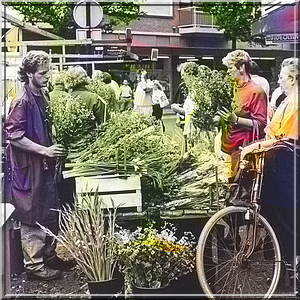 Afbeelding: Bloemen kopen op de Grote Markt, beginjaren ’80. Bron: Regionaal Archief Dordrecht.