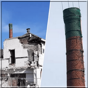 Die schoorsteen is een monument en dat is natuurlijk een prima zaak, maar ik heb nu toch écht het vermoeden dat het ding een flinke ‘tik’ heeft gekregen, misschien wel als gevolg van de  recente sloopwerkzaamheden (de oude woningen maken plaats voor nieuwe) in dat stukkie stad. Op de foto’s is duidelijk zichtbaar dat de schoorsteen, vooral aan de bovenkant, vol met scheuren zit en – volgens mijn inschatting staat dat bovenste deel ook een stuk schever dan voorheen. Kortom, ik heb zo het idee dat de DMI-pijp, laat ik het voorzichtig zeggen, nog nét niet op instorten staat óf – en dat lijkt me dan waarschijnlijker – dat de top er straks zomaar ineens vanaf lazert. De fotograaf die me de beelden stuurde vertelde er ook bij dat hij, eerder in de week, fotograferende brandweermensen bij de pijp waarnam en die stonden daar natuurlijk niet vanwege een toeristenfolder.