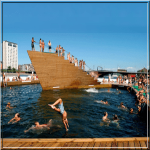 Nee, het is op dit moment nog niet het gezellige plein dat het zou moeten zijn. Toch heeft het Energieplein, of beter gezegd dat hele gebied rondom Energiehuis en Kinepolis, wel degelijk potentie. Twee coronazomers maakten mij in ieder geval duidelijk dat de Dordtse jeugd deze plek steeds beter weet te vinden; vooral de trappen aan het water (met fraai zicht op Villa Augustus en leuke woningen in Stadswerven) groeiden uit tot een ware ontmoetingsplek en bij warm weer dook de Dordtse jeugd hier massaal het Wantij in. Eigenlijk, zo constateerde ik met een vooruitziende blik in 2010 al, is dit stukje Dordt dé ideale plek voor een open water zwembad naar Scandinavisch model. Zo’n tien jaar geleden, in mijn eerste columnjaar voor deze krant, schreef ik dat een zwembad á la het ‘Havnebadet’ (havenbad) in de Deense havenstad Aalborg – en ik citeer nu even mezelf – ‘hélemaal Stadswerven’ is. Tijdens een vakantie in Denemarken (waar ik vaak en graag kom) ontwaarde ik, in die stad, gelegen tussen twee aangemeerde historische schepen, namelijk iets bijzonders… een reusachtige ponton in het water, waarvan de zijkanten als filters dienden om het rivierwater (dat dus van buiten uit door die diffuse wanden naar binnen sijpelt) ‘zwemschoon’ te maken. Alles, zo legde iemand mij uit, gebouwd met duurzame materialen. Er waren ook terrasjes, toiletten en houten platformpjes (met duikplank), waar de Aalborgse jeugd (want toegang gratis) gretig gebruik van maakte. Het ‘Havnebadet Aalborg’ werkt volledig op zonne-energie en is bekostigd door de gemeente in samenwerking met alle grote bedrijven uit die stad. Mijn eerste gedachte (ik schreef er al vaker over) was: ‘Zoiets zou in Dordt zeker niet misstaan.’
