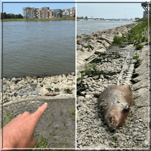 Nee, het is geen prettig gezicht… die aangespoelde dooie bever op het puntje van Stadswerven. Van Kees Aantjes, ook wel bekend als De Vloggende Bestemming, hoorde ik gisteren dat het dier daar lag. ,,Ik vermoed dat hij gestorven aan een buikwond; wellicht veroorzaakt door de schroef van een boot.’’