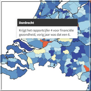 Alle steden en dorpen op dat kaartje hebben een kleurtje: hoe blauwer hoe beter… hoe roder hoe slechter. Een paar ‘vuurrode’ gemeentes scoren écht rampzalig: Rotterdam bijvoorbeeld en Heerlen in Zuid-Limburg. Op de Waddeneilanden, in het ‘rijke’ Gelderse Rozendaal, in het noorden van Twente en aan de Zeeuwse kust (op Walcheren) is het leven blijkbaar pas écht een feest. Daar kleurt de kaart immers letterlijk hemelsblauw.