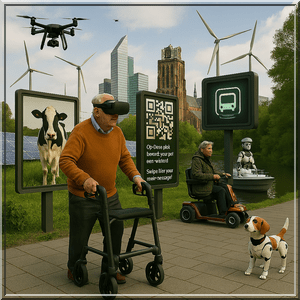 Dordt en de regio vormen in 2060 een bruisende metropool waar je struikelt over holografische bushaltes en robotmatroosje op de waterbus. Zijn er dan nog polderlandschappen? Ja hoor… als QR-code op een informatiezuil: ‘Op deze plek bevond zich ooit een weiland. Swipe hier voor meer nostalgie.’De vergrijzing dendert intussen vrolijk door. Over een jaar of 35 telt de Drechtstedenregio (die dan vermoedelijk ‘Drechtopolis’ heet) meer 75-plussers dan er bitterballen in een dorpskroeg passen en de scootmobielfile bij de Lidl wordt dan ongetwijfeld onderdeel van het ochtendnieuws. En de beroepsbevolking? Ach ja, die is er ook nog: ergens tussen de 227.000 en 288.000 mensen. Die kúnnen werken, afhankelijk van hoeveel robots we dan inzetten.