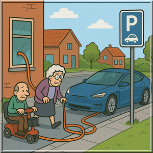 Ik zie het al helemaal voor me: kabel uit het raam, over het trottoir, naar de heilige graal: een parkeerplek voor de deur. Wie elektrisch rijdt, mag straks kennelijk ook territorium afbakenen, ofwel… welkom in de Kabelrepubliek. Waar de stoep niet langer van iedereen is, maar van wie zich een Tesla, Kia of stekker-Skoda kan veroorloven. De rest mag omlopen. Of struikelen. Rolstoelgebruikers, slechtzienden, ouders met kinderwagens… zij worden straks figuranten in het nieuwe Dordtse gezelschapsspel, getiteld ‘Ontwijk de Kabel.’