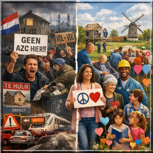 Gelukkig hoor je zo nu en dan ook nog wel eens een ander geluid… in Nieuw-Lekkerland bijvoorbeeld. Terwijl vlaggen tegen een mogelijk AZC daar momenteel het straatbeeld domineren, liepen zo’n dertig inwoners in een vredesmars door het dorp. Geen geschreeuw, geen dreigementen, maar hartjes en gesprekken. Suzie Klapwijk zag haar dorp verharden en koos niet voor tegenstand, maar voor menselijkheid en wederzijds begrip.