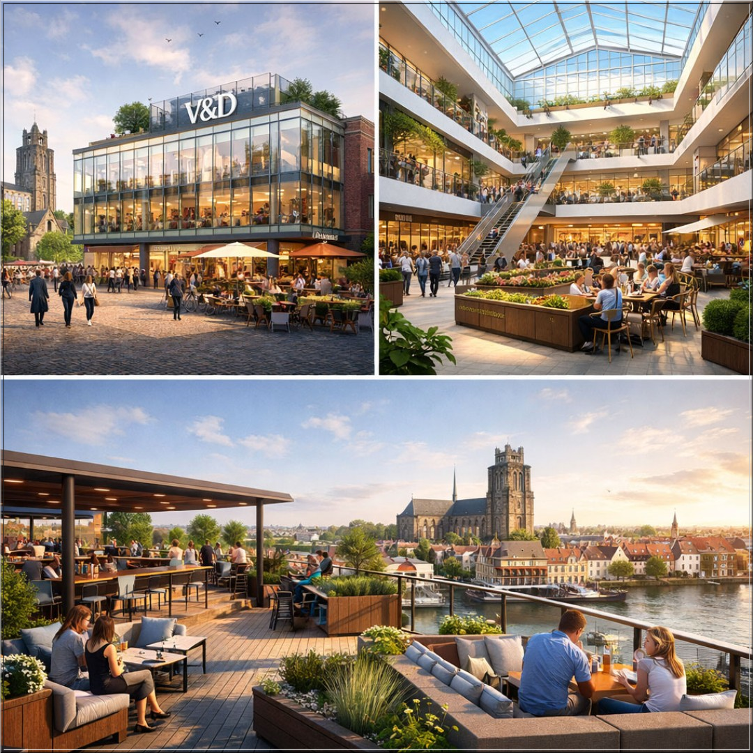 En als we dan toch bezig zijn met dromen: maak van die benedenverdieping iets waar je vanzelf naartoe wordt getrokken. Geen voorspelbare ketens, maar een versmarkt waar je kruiden ruikt die je niet kunt uitspreken en brood koopt dat nog warm is. Gooi er een paar koffiebarretjes bij en een paar pop-upshops die elke paar maanden wisselen… dan wordt het V&D-pand niet alleen een plek waar mensen wonen, maar ook een plek waar je even binnenloopt om te verdwalen en om er een uur later weer uit te komen met een tas vol lekkers en nieuwe energie.